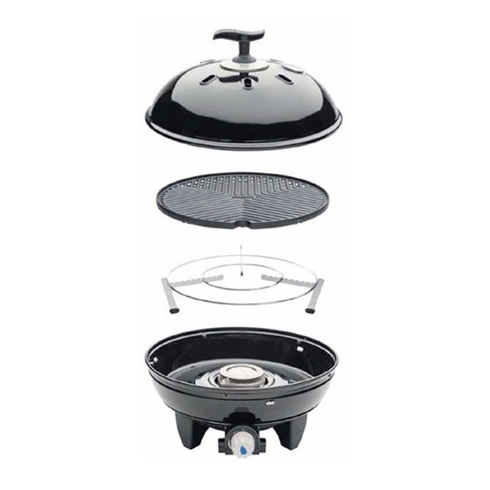 Denne robuste, kompakte og bærbare bordgrill med non-stick overflade og 38 cm grillflade er perfekt til grillning af kød, fisk eller grøntsager. Den kraftige porcelænemaljerede overflade fanger og tager sig af varmen for den bedste udendørs ydeevne. En stabil grydeholder er inkluderet, så du let kan koge vand og tilberede tilbehør til din middag osv. Pakkes nemt sammen i en robust taske. Til tilslutning med slange.