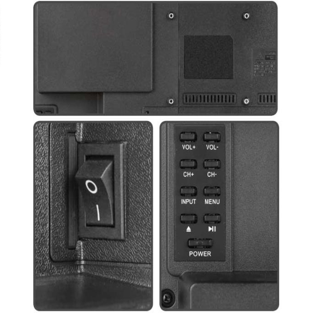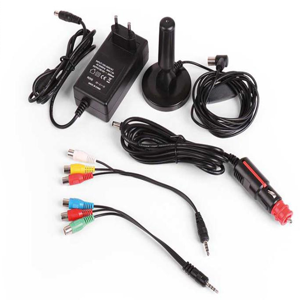 Leveringen inkluderer: LED-tv, tilslutning 100-230v, 12V adapter til cigaretstik, DVB-T antennestik, mini AV-kabel, mini Ypbpr-kabel, fjernbetjening og instruktionsbog.