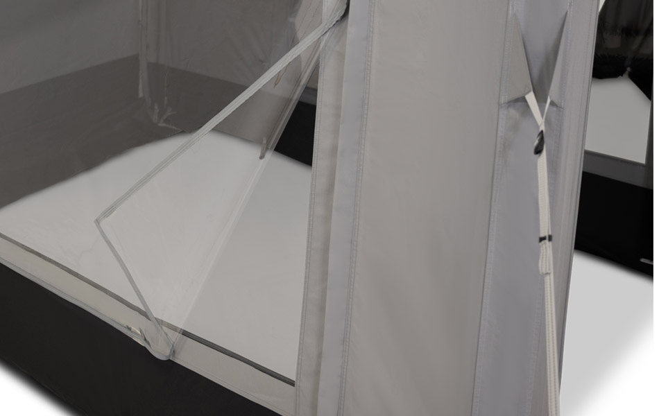 Forlængelsen er lavet af Weathershield Tour ripstop-polyester, et holdbart materiale med stærk UV-modstand og fuldstændig vandtæt beskyttelse. Til ekstra komfort medfølger moderne indvendige gardiner, der beskytter mod dagslys og glider let i holdbare skinner.
