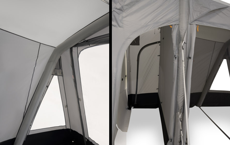 Hver gavl har en praktisk dør, der gør det nemt at komme ind og ud fra begge sider. Frontpanelet kan rulles op for øget ventilation eller bruges som ekstra indgang, når mere plads er nødvendig. Alle vinduer og døre har mørklægning for ekstra komfort og privatliv. Tunnelen har også egne adgangspunkter for nem adgang.