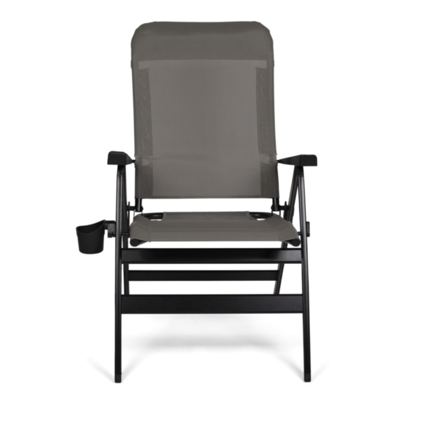 Med syv justerbare positioner kan stolen tilpasses både til måltider og afslapning. Den indbyggede kopholder gør det nemt at have drikke ved hånden.