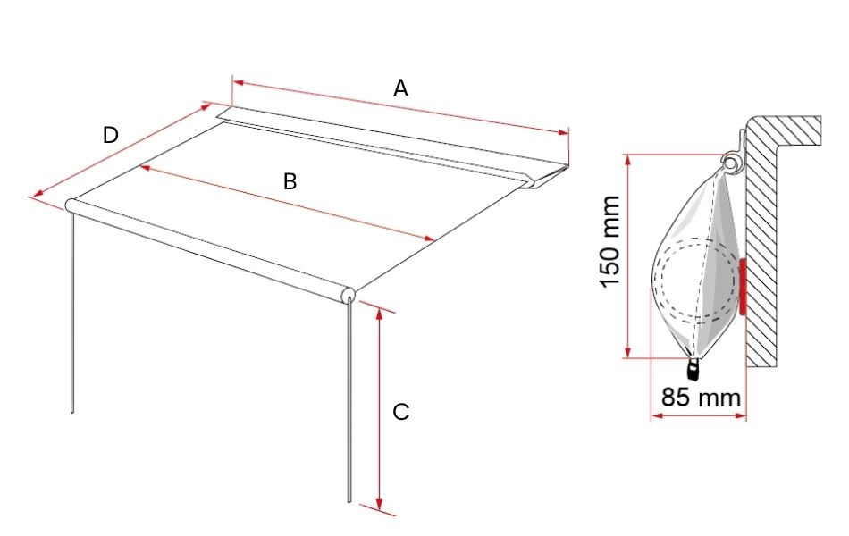 Begynd med at måle den lige strækning hvor markisen skal monteres. Dette er det vigtigste mål og afgør hvilken længde du kan vælge.