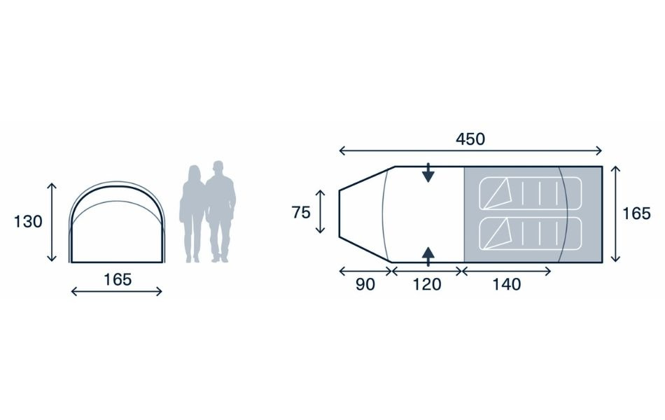Teltdugen er fremstillet i slidstærk 75D polyester og kombineres med glasfiberstænger som giver en stabil konstruktion. Indvendige organiseringslommer gør det nemt at holde styr på mindre udstyr.