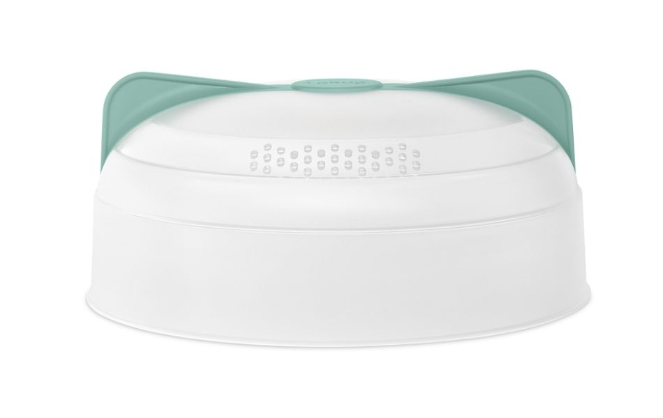 Det smarte låg har dobbeltsidede håndtag, som gør det nemt at løfte af, uanset hvordan det har drejet under opvarmning. Formen passer til de fleste tallerkener og er designet, så låget ikke ligger direkte mod maden. Dampen slipper ud på en kontrolleret måde, hvilket hjælper med at bevare fugten i maden samtidig med, at indersiden af mikrobølgeovnen holdes ren.