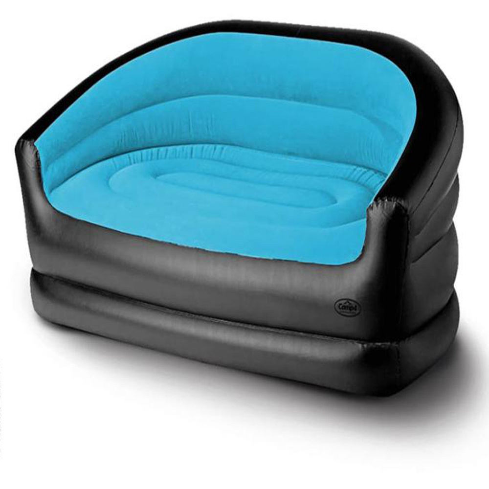 Oppustelig sofa i farverne sort/isblå. Må ikke benyttes på en overflade med skarpe genstande. Materiale : Dimensioner på flokket PVC: 145 x 78 x 65 cm.