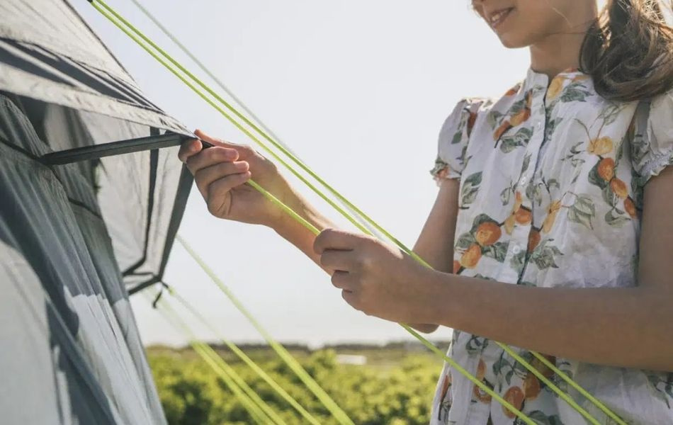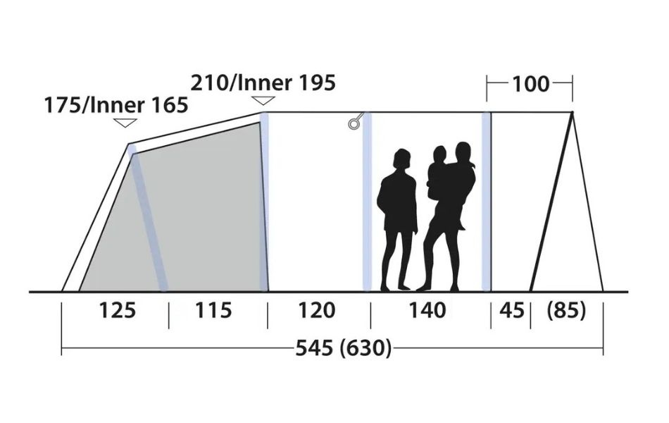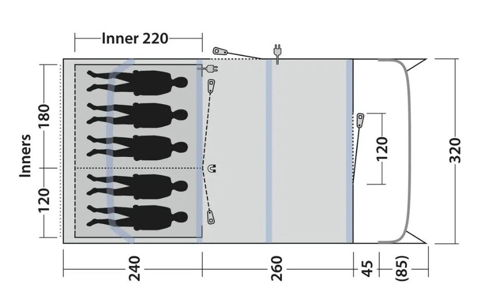 Teltet rummer op til fem personer i to mørklagte soveværelser og giver komfortabel indkvartering for familieeventyr. Ventilation via mesh-paneler og ekstra sidedør sikrer frisk luft og fleksibel adgang. Det lyse, varmt tonede ydertag skaber en hyggelig indendørs atmosfære.