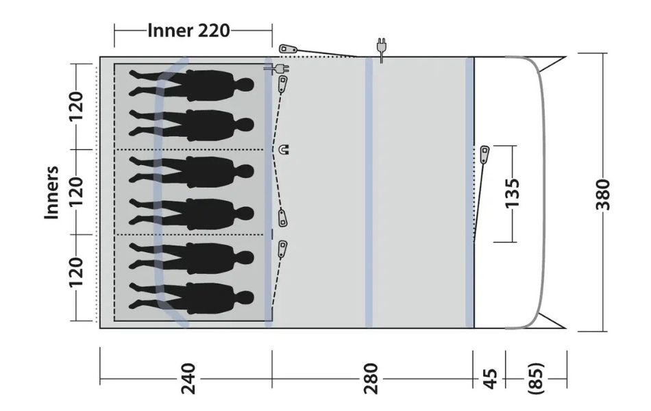 Tekstilsammensætning: Yderdug 100% polyester, Indertelt 100% polyester, Mesh 100% polyester, Bæretaske 100% polyester
