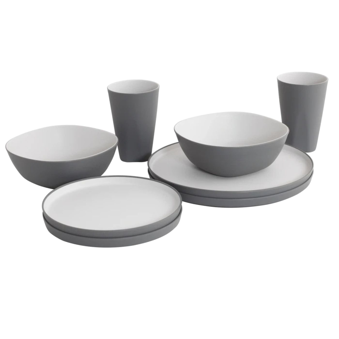 Sættet indeholder tallerkener, skåle og krus. Det brudsikre materiale gør det sikkert at anvende i køretøjer. Krusene har hank og kan stables. Den skridsikre bund sikrer stabilitet og reducerer støj under transport.