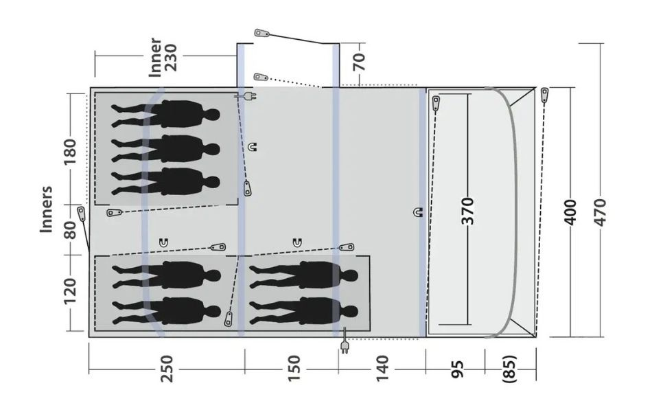 Det indsyede gulv beskytter mod træk og snavs, mens det aftagelige gulv i tredje zone giver fleksibilitet. Mørke Ambassador-soveværelser med meshventilation giver bedre søvnkomfort. Rain Safe sidedør og bagdør med meshpanel giver beskyttet og fleksibel adgang i al slags vejr.