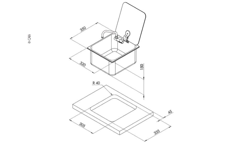Vasken er robust og praktisk – ideel til autocampere, campingvogne eller både. Udsparingsmål 305x335 mm.