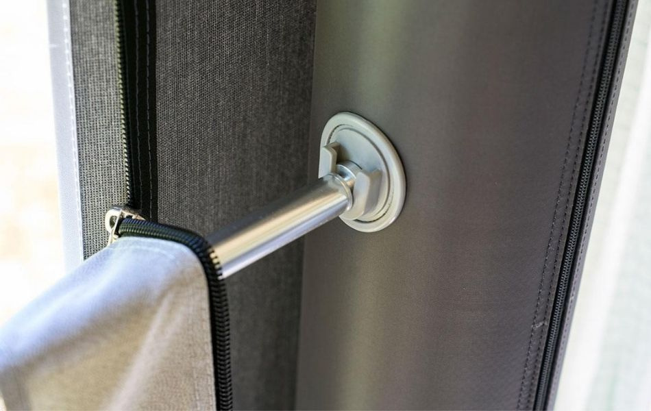 Sider og frontpaneler kan åbnes helt for at omdanne forteltet til et stort, åbent soltag, eller delvist for at skabe ekstra døre og ventilation på varme dage. Integrerede myggenet på siderne giver et behageligt indeklima uden at insekter slipper ind. Den medfølgende verandastang gør det nemt at skabe en hyggelig veranda, hvis du vil have et delvist åbent område foran.